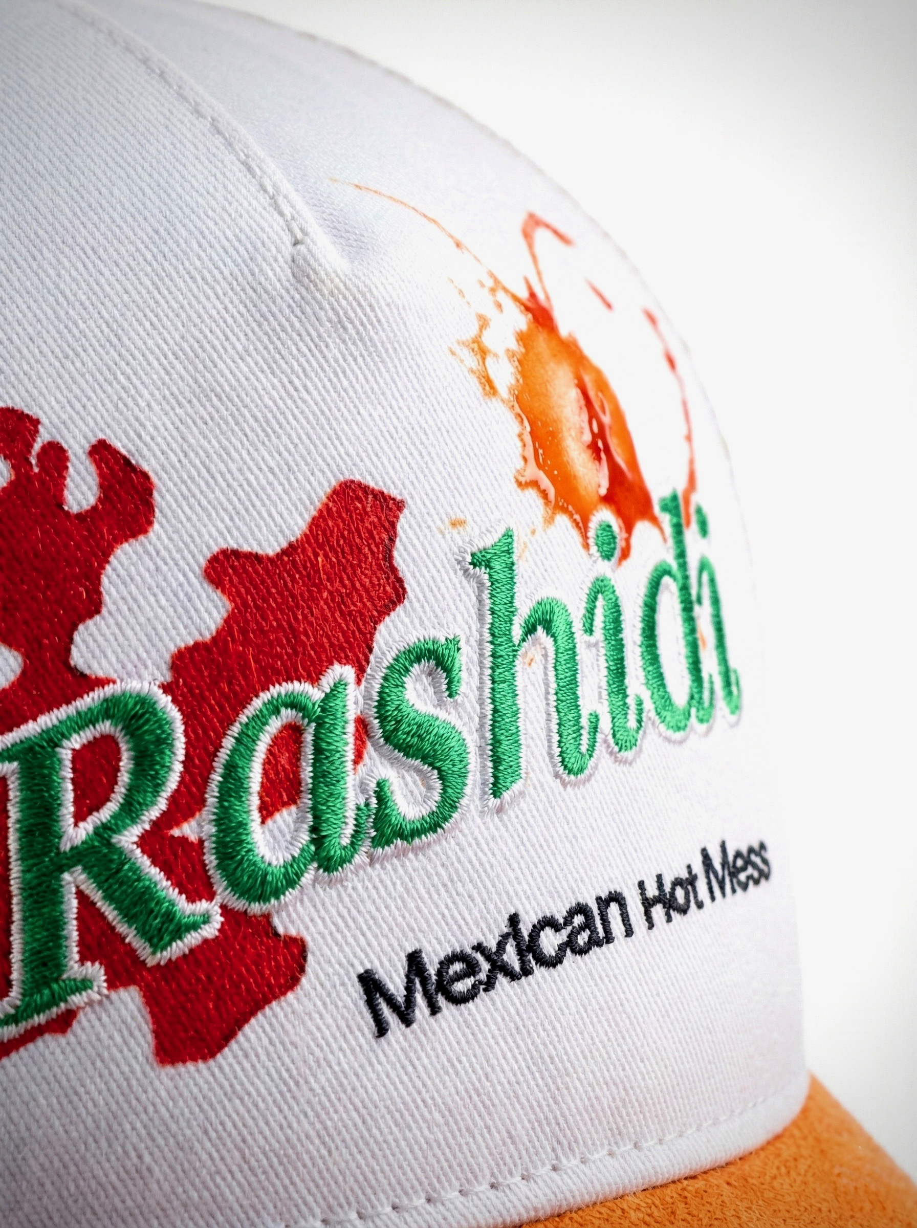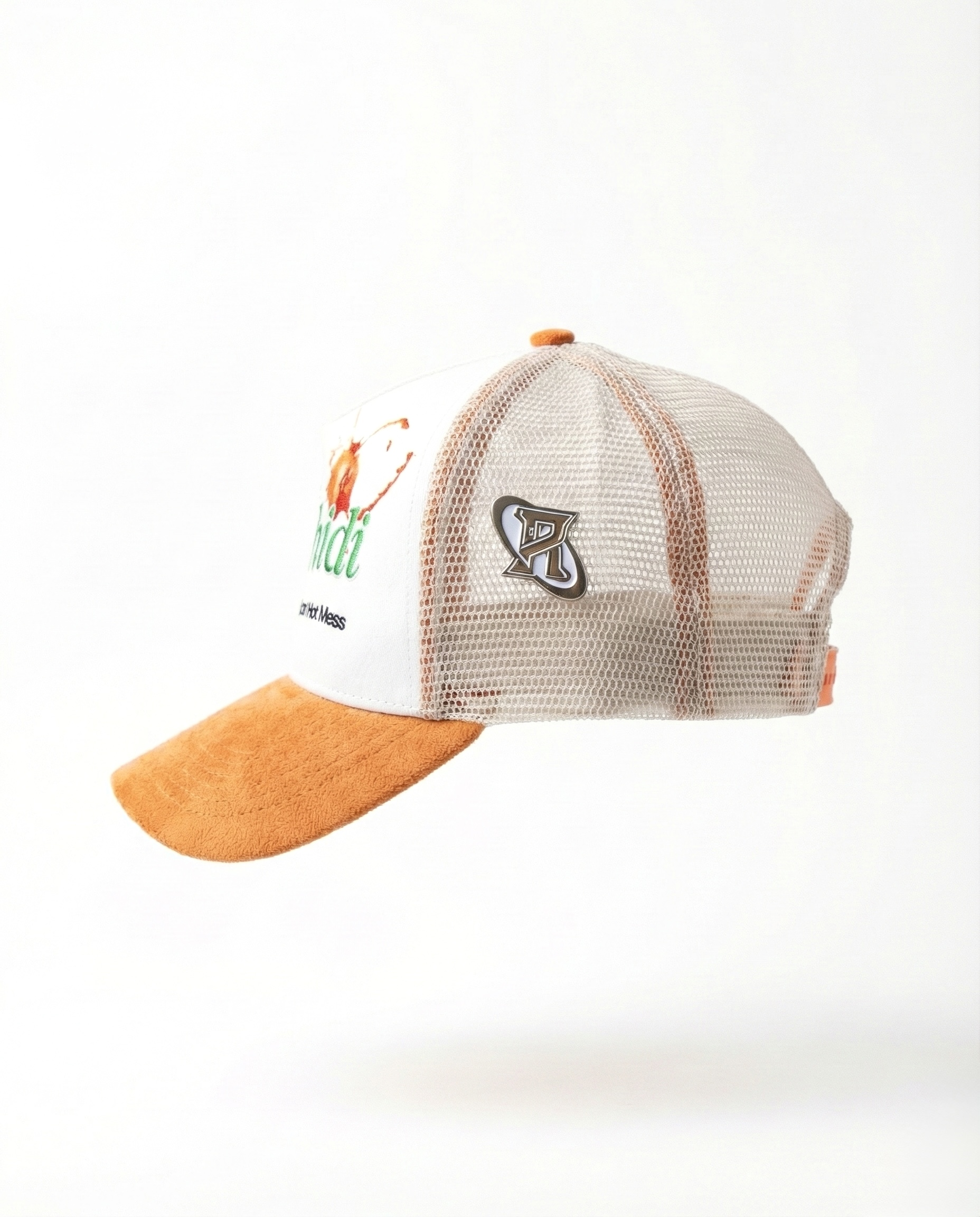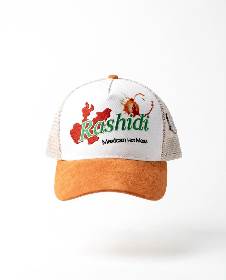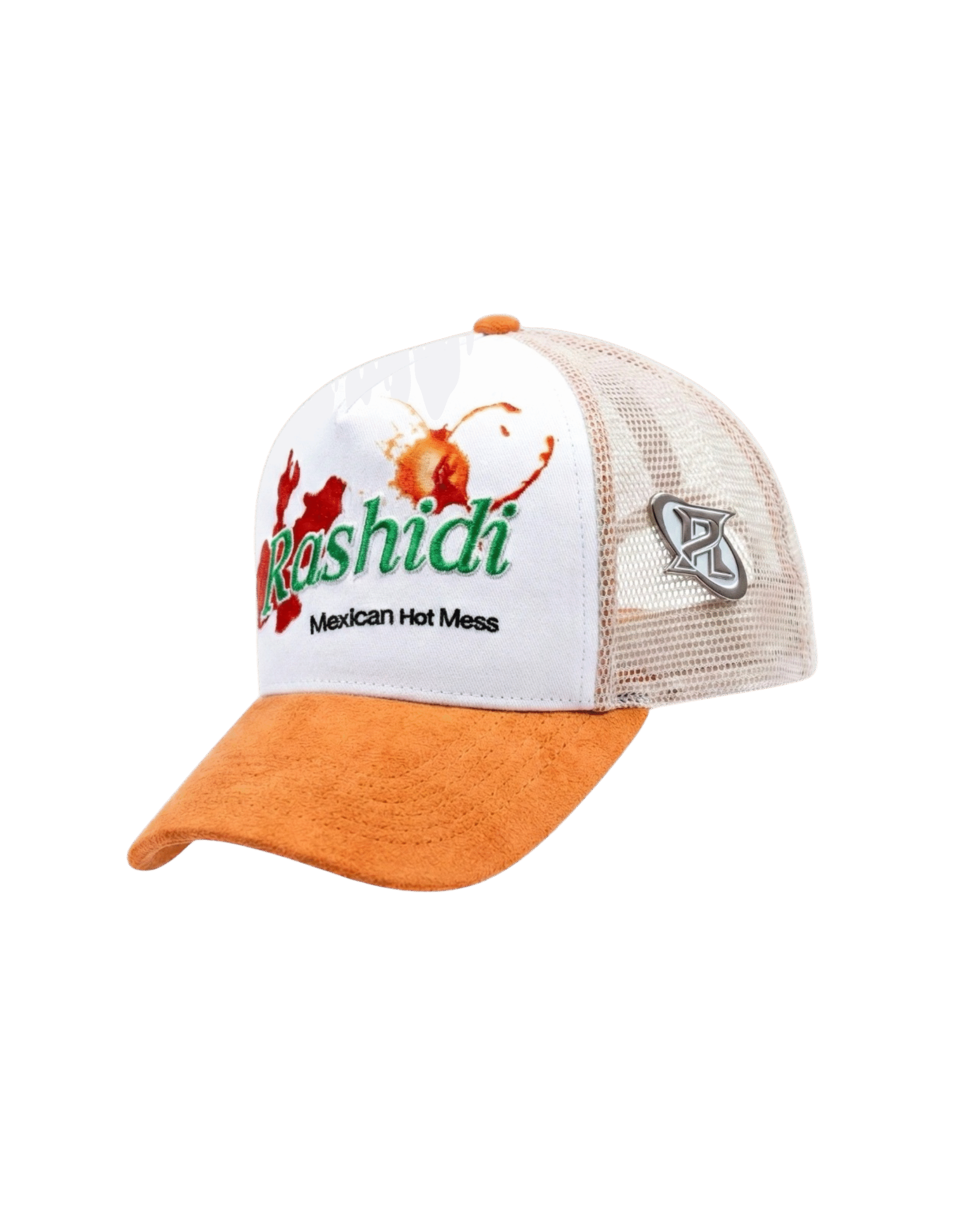 Gorra trucker con frente blanco de espuma, visera y boton de gamuza naranja vibrante y malla beige. Logo de salsa tapatía bordado en verde con mapa de Jalisco bordado en rojo. Manchones impresos tipo salsa picante y el tagline bordado: “Mexican Hot Mess”. Incluye un pin metálico de alta calidad con motivo del logo de la marca.