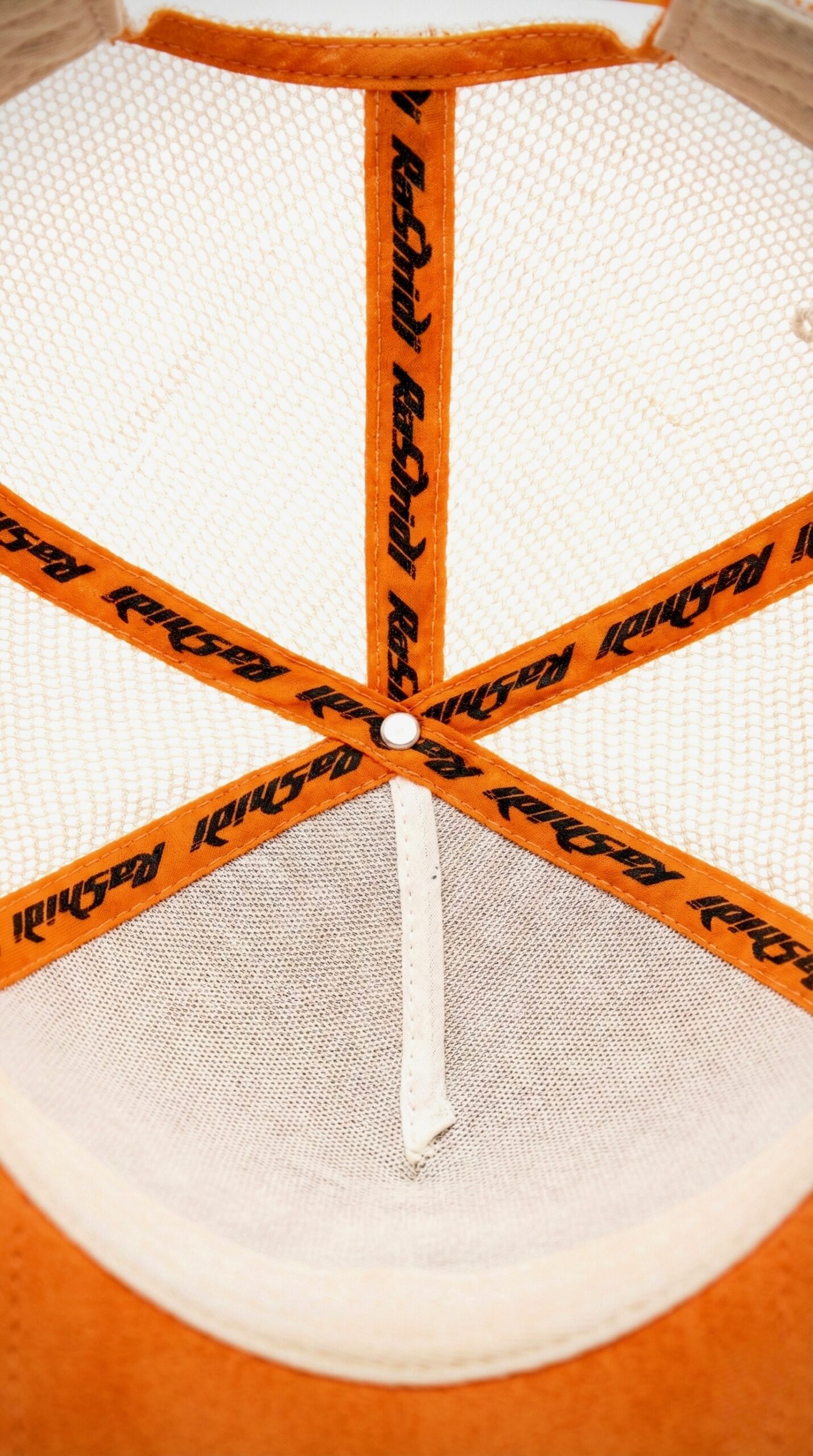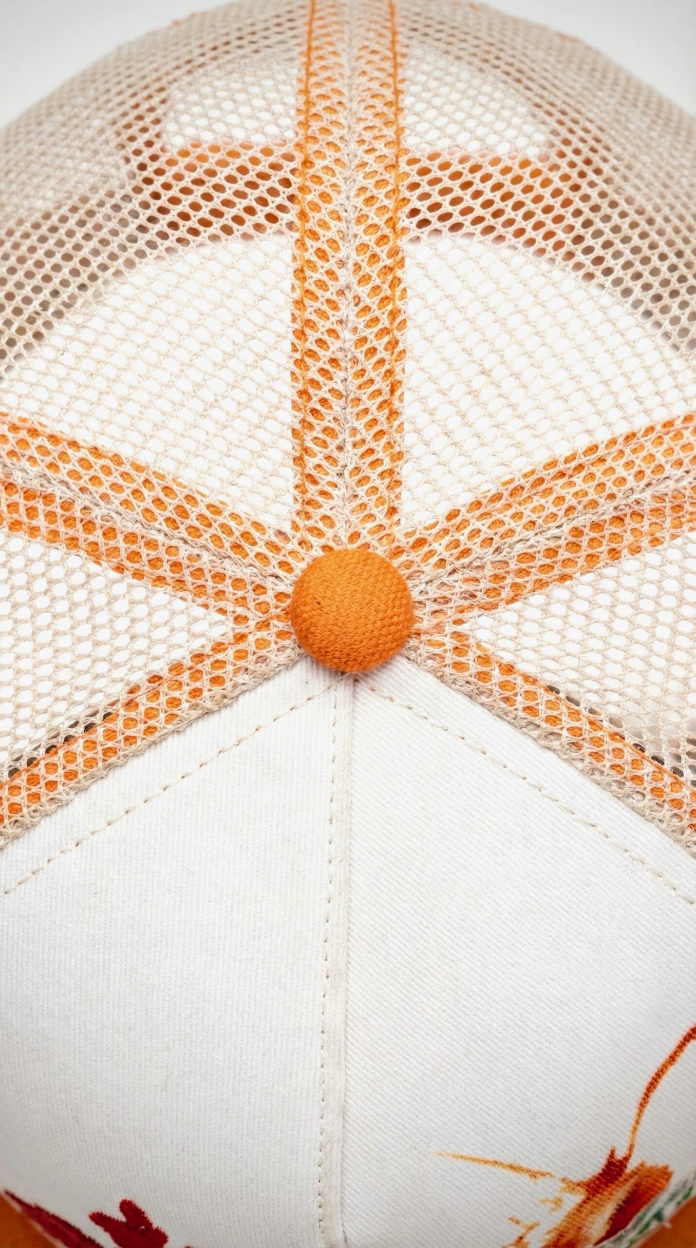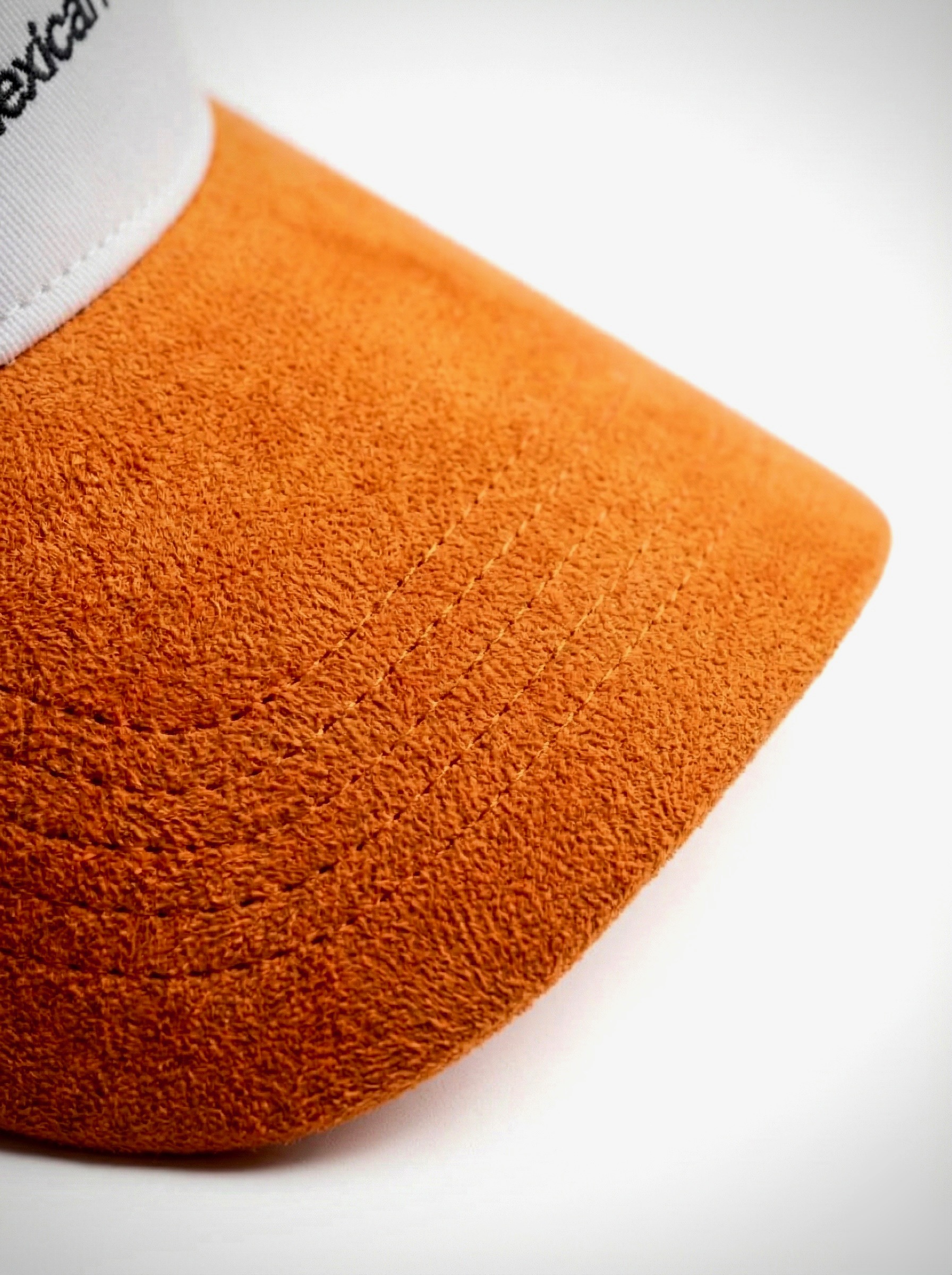 Gorra trucker con frente blanco de espuma, visera y boton de gamuza naranja vibrante y malla beige. Logo de salsa tapatía bordado en verde con mapa de Jalisco bordado en rojo. Manchones impresos tipo salsa picante y el tagline bordado: “Mexican Hot Mess”. Incluye un pin metálico de alta calidad con motivo del logo de la marca.