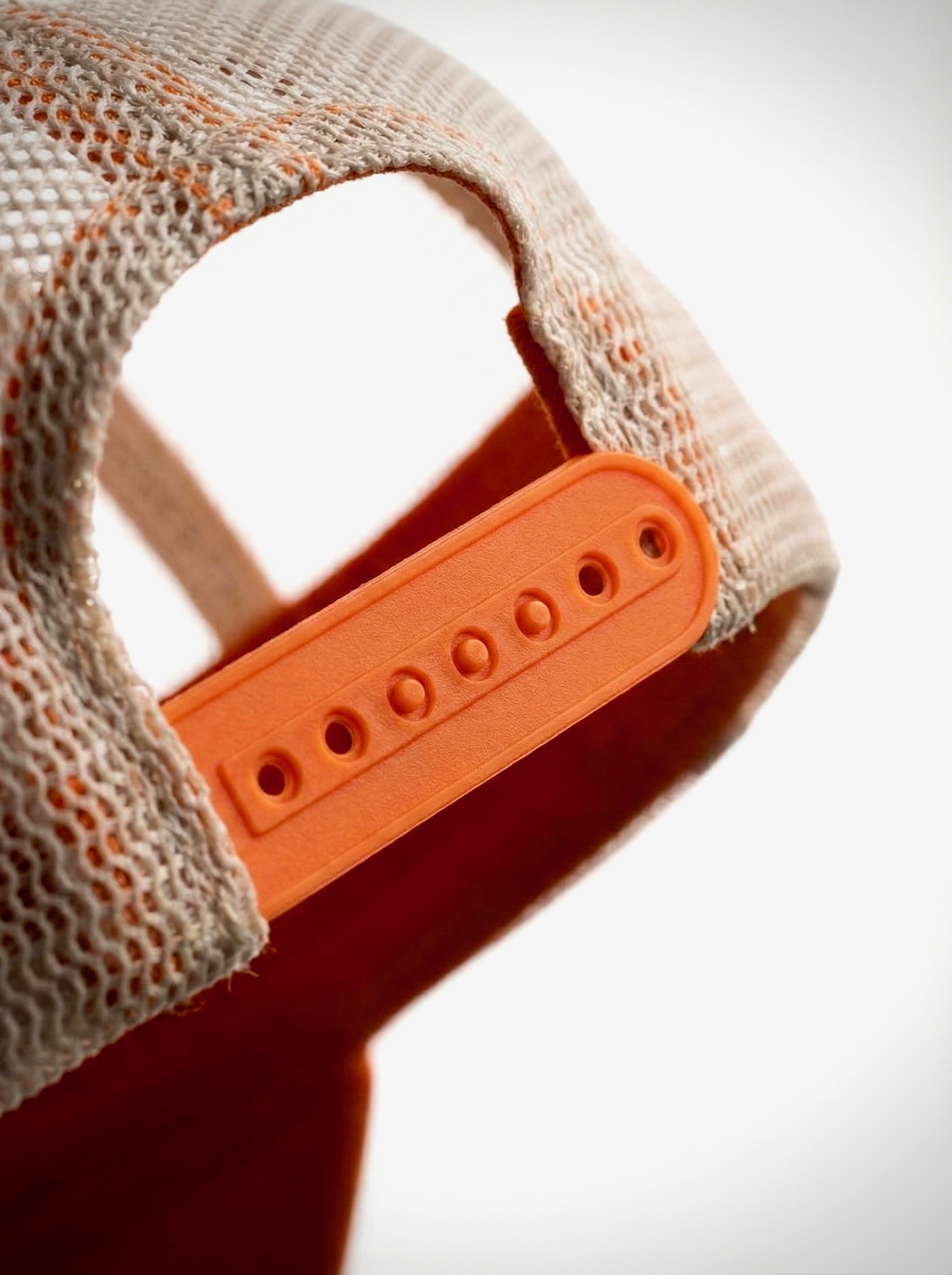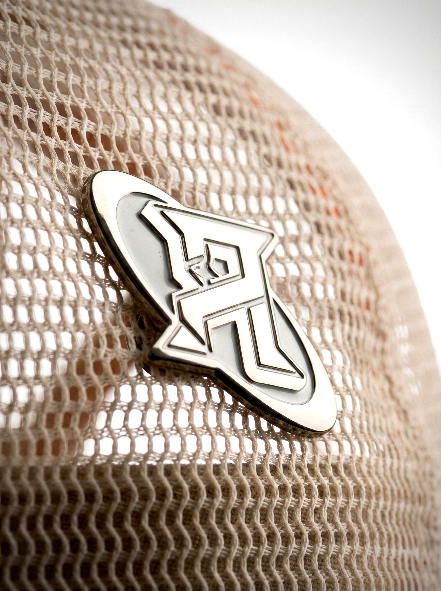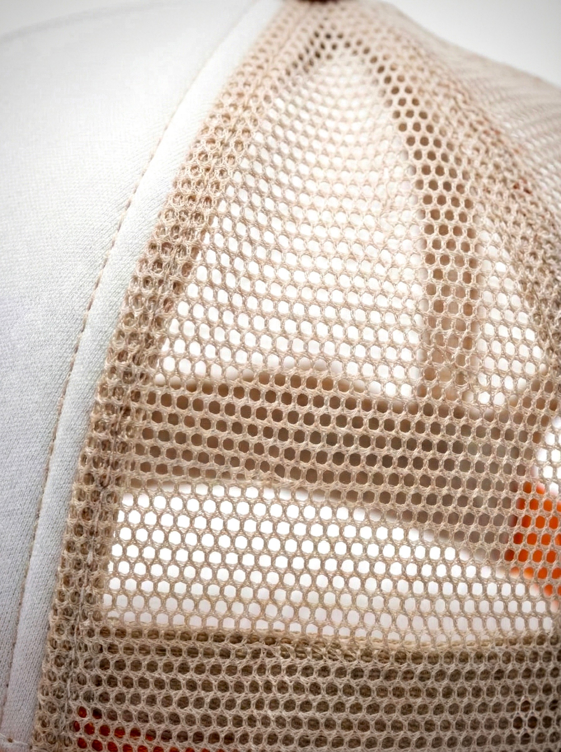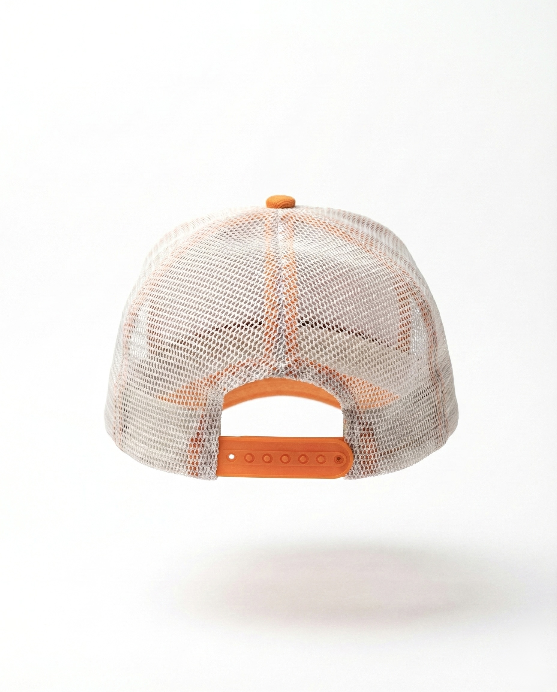 Gorra trucker con frente blanco de espuma, visera y boton de gamuza naranja vibrante y malla beige. Logo de salsa tapatía bordado en verde con mapa de Jalisco bordado en rojo. Manchones impresos tipo salsa picante y el tagline bordado: “Mexican Hot Mess”. Incluye un pin metálico de alta calidad con motivo del logo de la marca.