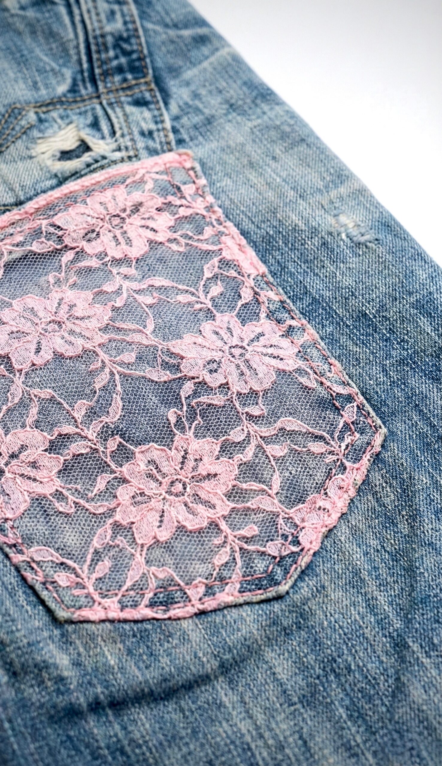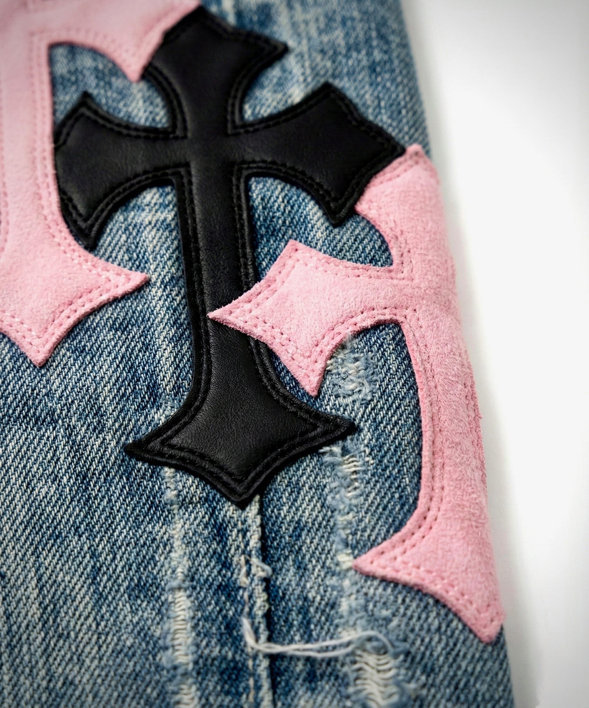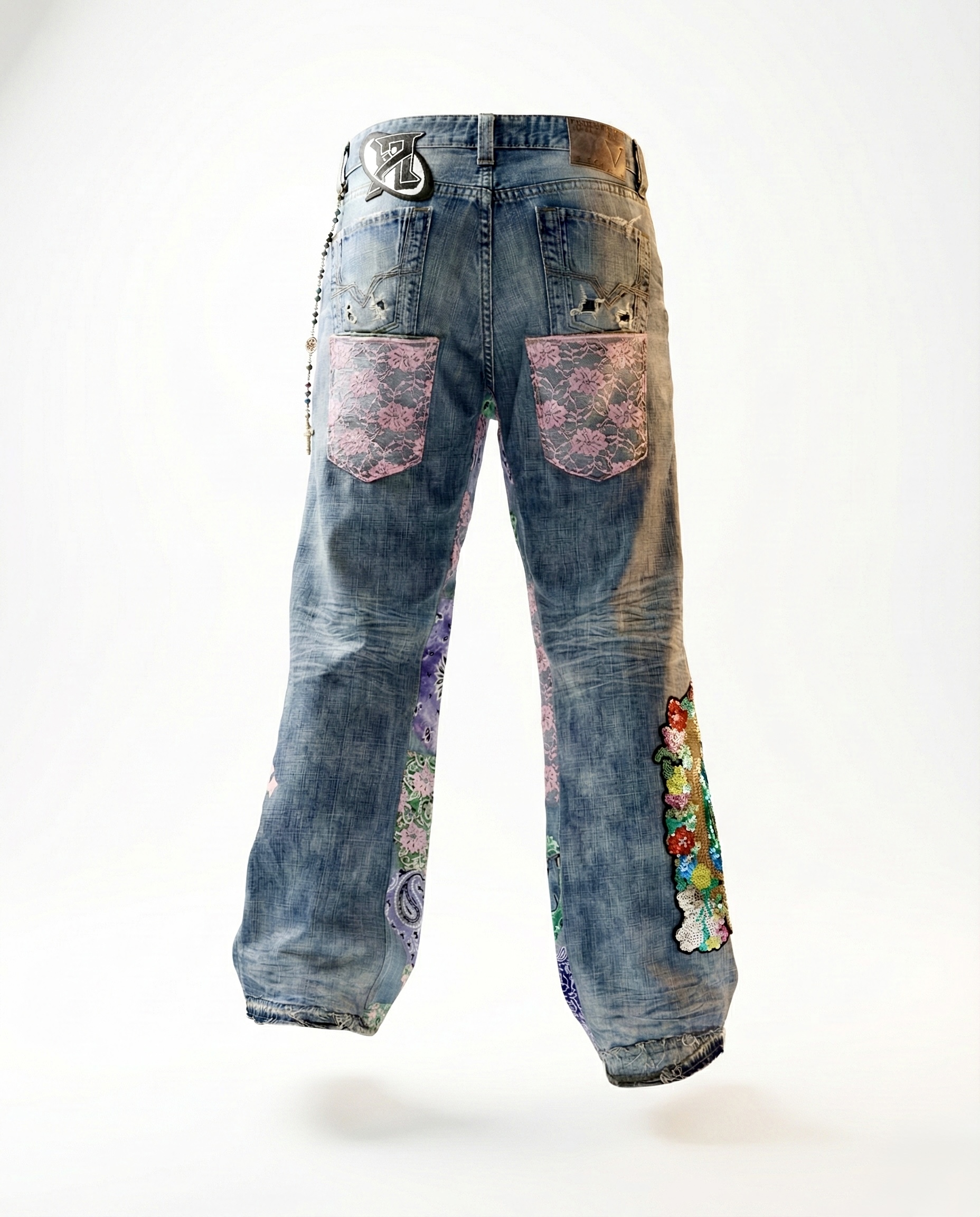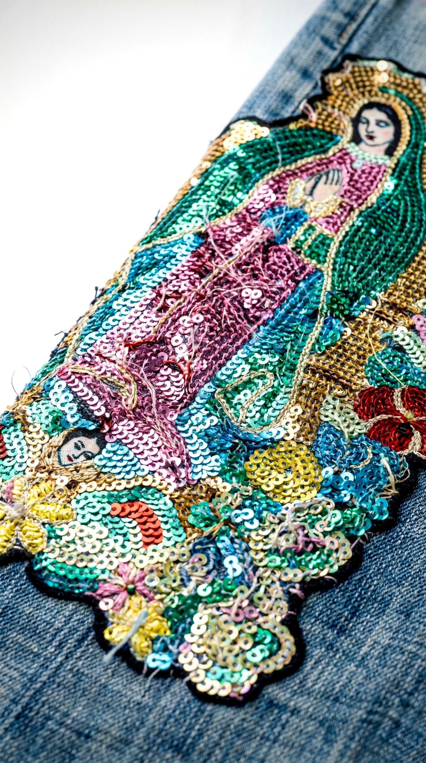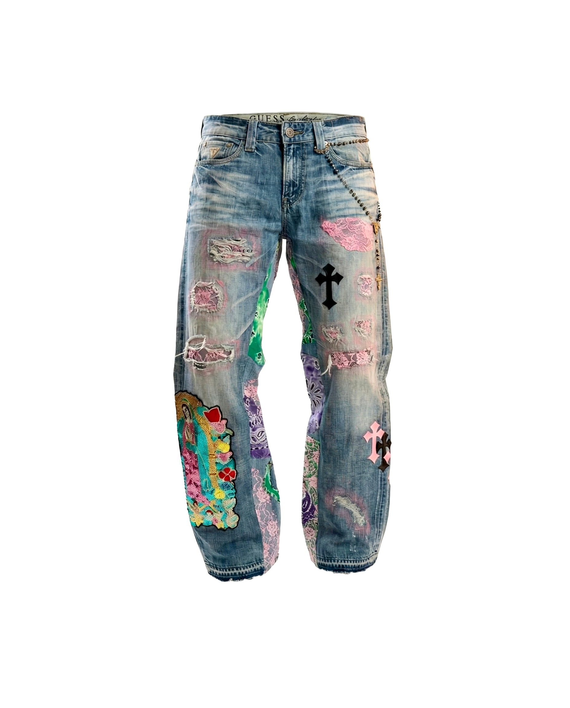 Pieza de altar 1 of 1 intervenida sobre denim lavado claro Guess premium. Corte baggy recto con bastilla sin terminar. Intervenido con patchwork de paliacates verdes y morados, encaje rosa y cruces aplicadas en contraste. Incluye roturas reparadas “a la mala” y doble bolsa en los traseros del pantalón. Virgen de lentejuelas bordada en un costado y un rosario de cristales morados de la Virgen de Guadalupe.